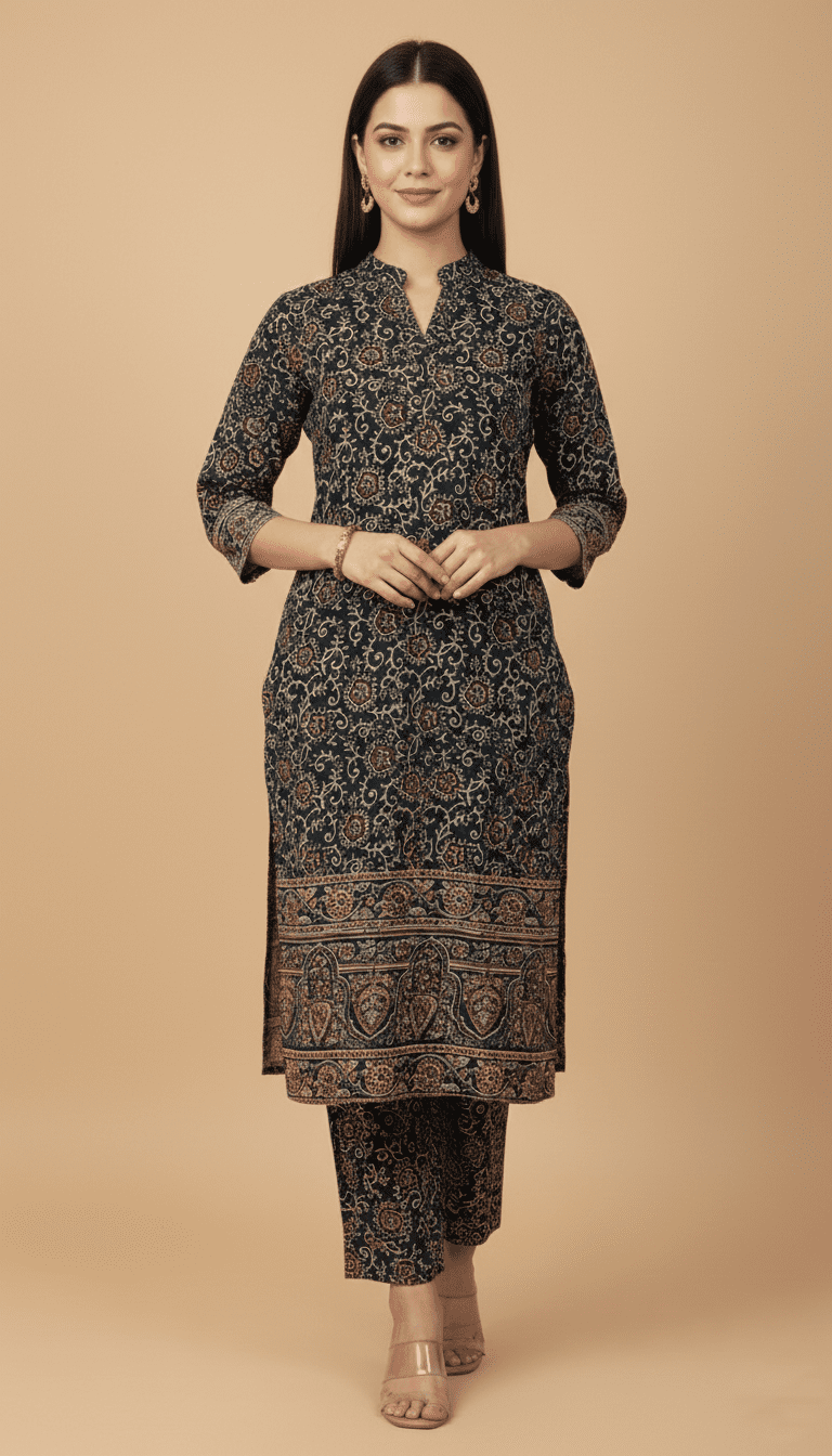 Upgrade your ethnic wardrobe with this timeless Hand-Block Printed Co-ord set. Crafted from premium breathable cotton, this outfit features a classic Ajrakh-inspired floral pattern.