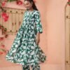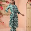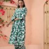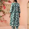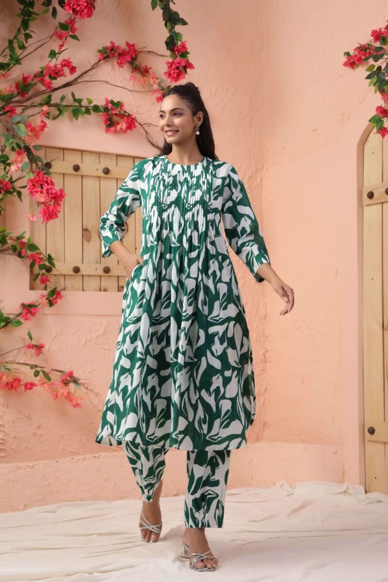 This stylish green co-ord set showcases an artistic white leaf print, perfect for a refreshing and vibrant look.